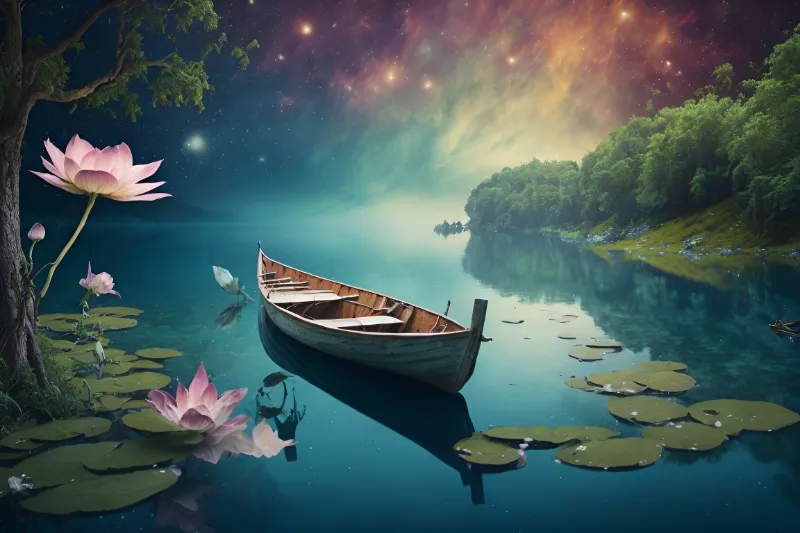 Fairytale Surreal Background On Lake With Boat (4898 downloads )