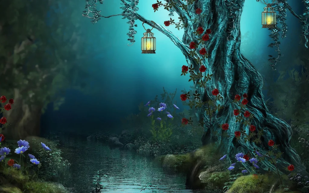 “Fantasy-Flowers-Forest-Lamps-Nature-Night-Red-Roses-River” by Ishtaure.Dawn is licensed under CC BY-SA 2.0