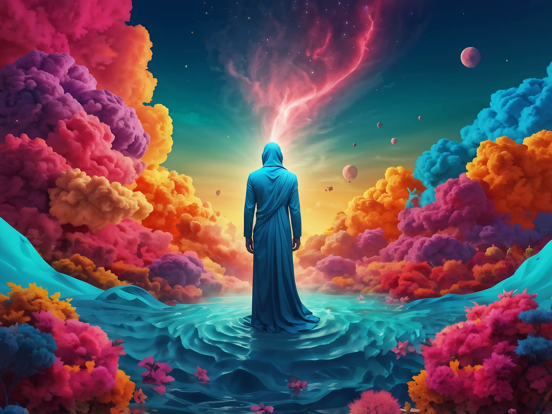 Surreal vibrant desktop background with guy in center
